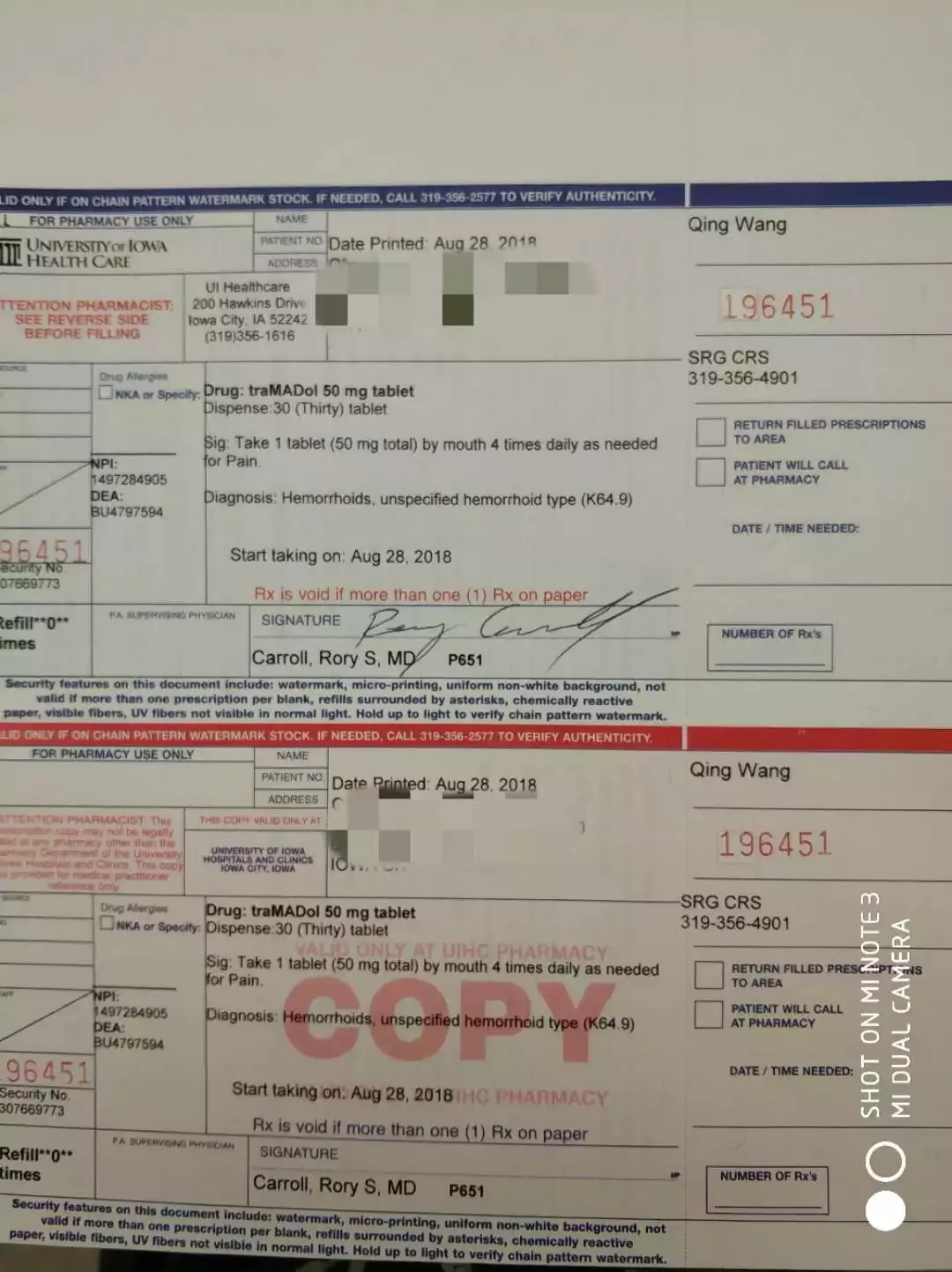 止痛药$0.25(感觉回到了国内),纤维素$5,文书、处方、止痛药如下。