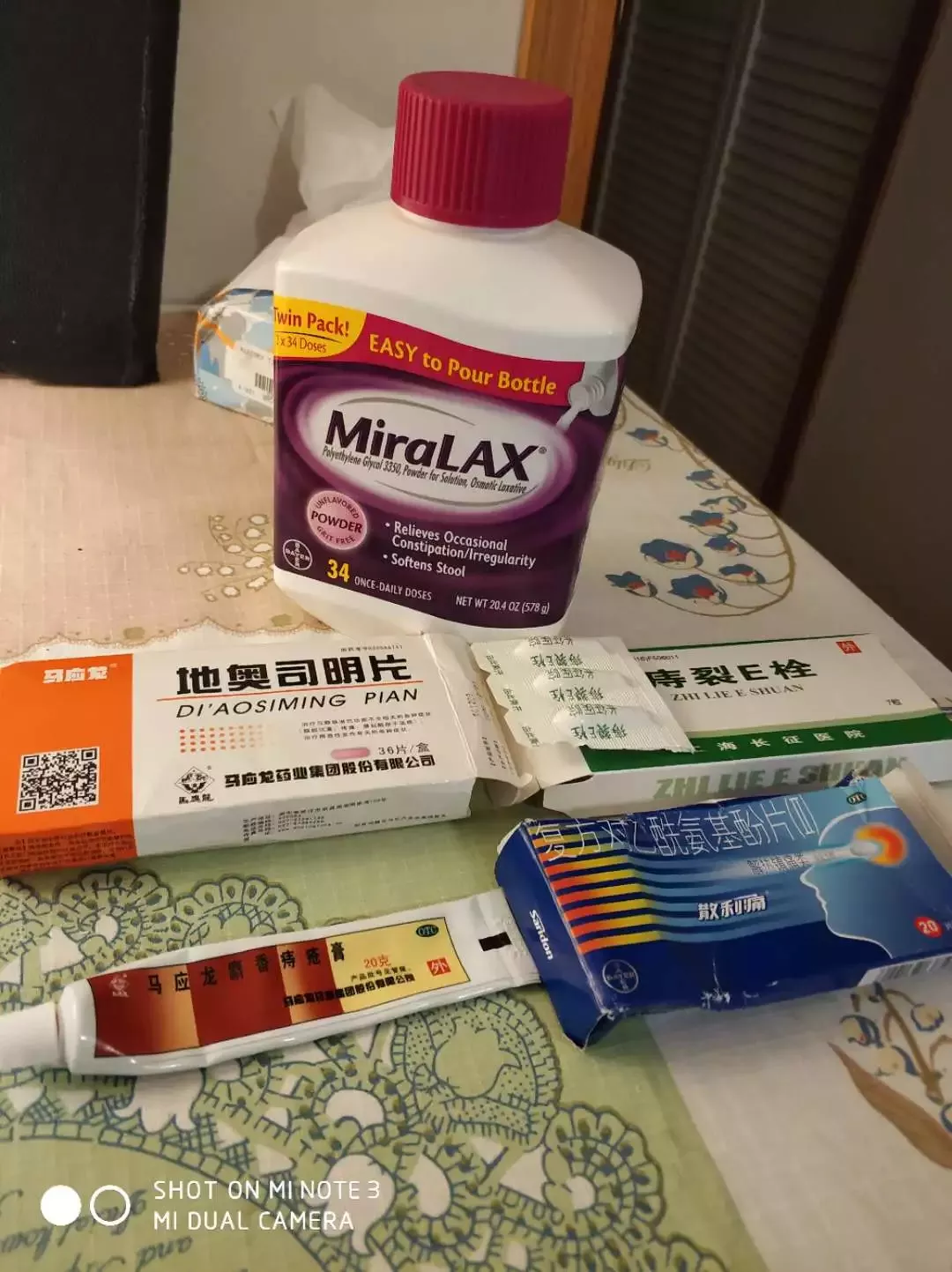 Rx: 温水坐浴,每次15min,每日多次; 马应龙软膏,外用,1日3次; 长征医院自制神药痔裂E栓,纳肛,1日3次; 疼痛剧烈时,口服散利痛(复方对乙酰氨基酚)2片/次,口服,3次/日; 地奥司明片,4片/次,口服,2次/日; 通便药,MiraLAX,2勺/次,冲服,2次/日(房东苑老师赠送,感谢苑老师对我的照顾)。