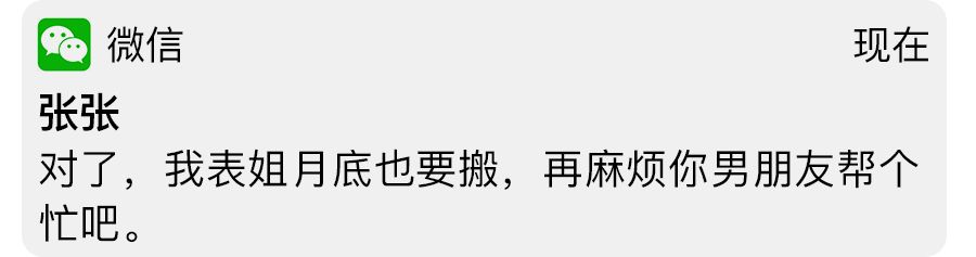 在她的新家,闺蜜指挥你男友做这做那,语气自然得不像话。 免费帮她忙活了一天,闺蜜也没任何表示,你很郁闷。 回家的路上,她又发来一条消息: