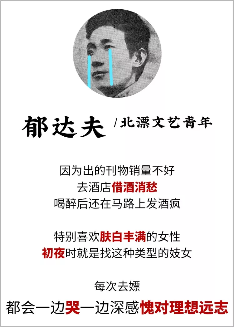 如果说前面几位民国大师,都是因为自身喜欢才去嫖娼 那郁达夫就不太一样了,他是自甘“堕落”和“沉沦”