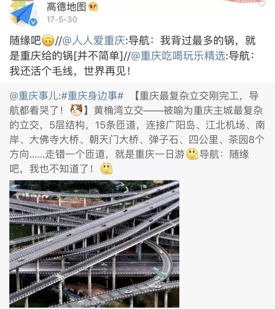 外地人才分东西南北 重庆人只看上下左右 在这里,GPS只是个摆设 不信,先领略下重庆定制版立交桥 5层结构,15条匝道 走错一条,就是重庆一日游了 ![[doge]](https://mmbiz.qpic.cn/mmbiz_png/EfVIlyKiaiaiaTQdc2LSsodqalePiaRCfYKNRfzEwjvAmysUrY0ExNufibP9RMH3bIsoNdJ2AkKVVXfu3ZPfHnZOUCA/640?wx_fmt=png&tp=webp&wxfrom=5&wx_lazy=1&wx_co=1)
