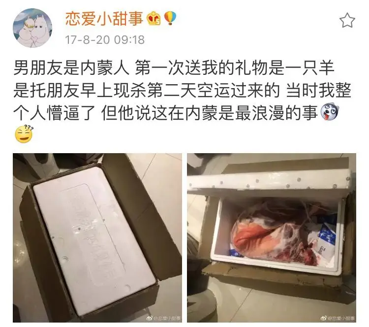 其实说起与羊的不解之缘 不光是蒙古 与它相邻的内蒙古更是如此 有位姑娘收到内蒙男友送的礼物 居然是一!整!只!羊! 👇