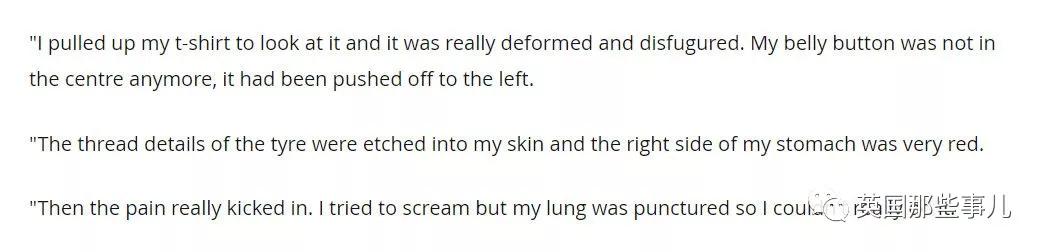 “我当时下意识的拉起我的T恤看了一下我的腹部,完全被压的变形了,我的肚脐眼已经跑到了腹部左边的位置... 轮胎表面的纹样也被清清楚楚的烙在了我的皮肤上,腹部变得非常红。 然后一瞬间巨大的疼痛感袭来,我想尖叫,但是我的肺好像当时也被压出了问题,所以我根本发不了声。”