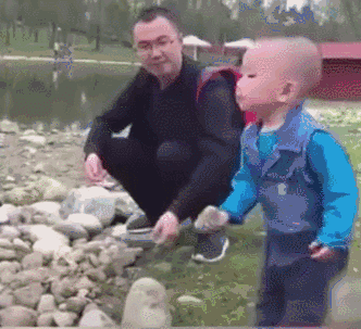 父子俩在河边儿玩扔石子 年幼的孩子想尝试 结果……