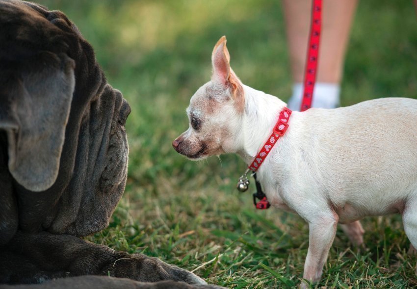 对视:在体重超过56公斤的玛莎面前,这只吉娃娃犬就像个小不点。
