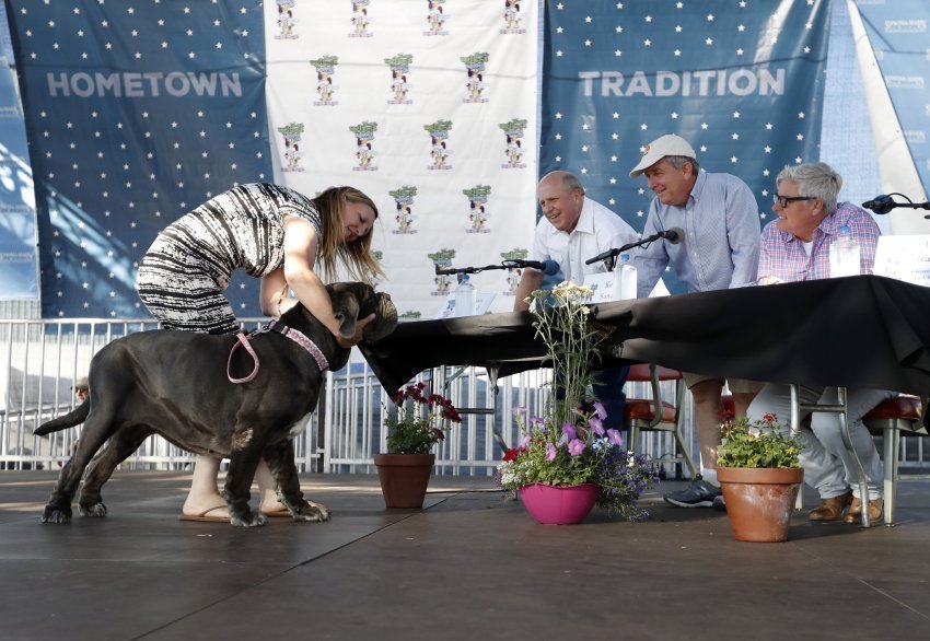 中国冠毛犬拉斯卡尔被主人举上台。