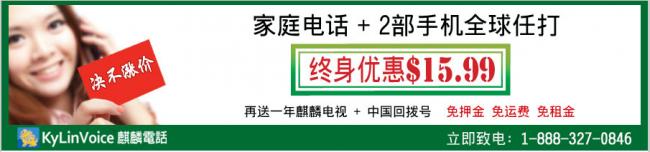 黑五购物不怕没买到最低价,Cyber Week现在提供挤破门(doorcraher)折扣:不是短短的3个月/6个月、之后又回到高额月费的的短期促销,麒麟电话提供终身优惠,座机+2 部手机无限拨打全球,月费终身价$15.99,再送一年中国回拨号+中文电视,下手要快哦!立即致电1-888-327-0846。