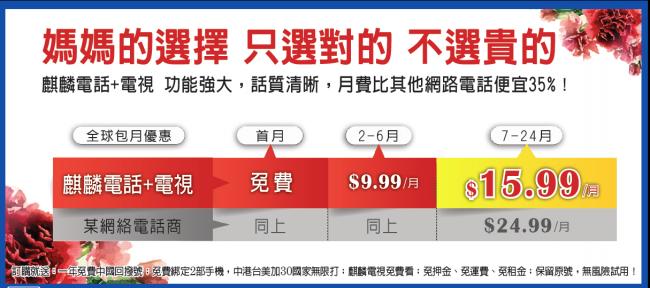 促銷至5/31/2015。訂購全球包月24個月計劃:第一個月免費,第2-6個月: $9.99/月,第7-24個月: $15.99/月。第一個月月費在訂購時還是會被收取,於3個工作日退。訂購全球包月12個月預付費計劃:送一個月免費,第2-3個月: $9.99/月,第4-12個月: $15.99/月,預付$9.99*2 +$15.99*9。訂購以上任一促銷可得免費麒麟套裝(價值【$16.99】/月),長城平台套裝(價值【$22.99】/月)或台灣套裝(價值【$22.99】/月)+影視點播(價值【$10】/月)+兒童天地套裝(價值【$10】/月)。免費中文電視開台費$50/年(第二年需至電麒麟電視才可得此優惠價)。免費電視只限1台電視機頂盒再加一台客戶自有設備 (智能電視/個人電腦/平板電腦),第一台電話及電視設備免押金及嗶M。不得與商家其它優惠合並使用。適用額外費用和稅項。麒麟電視保留對其商標, 商號及服務標識的權利。更多促銷規則詳情:請點這裡。