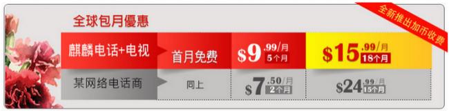 | 不是短短的兩個月$7.5優惠,之後漲到24.99; 現在訂購麒麟全球包月+麒麟中文電視,享受首月免費, $9.99/5個月的優惠;後18個月(7-24個月)月費只要$15.99,比BB電話更低,節省35%; 而麒麟電視功能更酷,用電視、電腦、平板、手機都能看!網絡電視中,只有麒麟電視提供最豪華、最完整並經授權的長城平台頻道,大批BB電話老用戶來電諮詢並轉訂了麒麟電視+電話+綁定二部手機的服務,用過的都說好!現在訂購,送一年免費中國回撥號;免押金、免運費、免租金;保留原號,無風險試用!立即致電1-888-327-0846了解詳情。