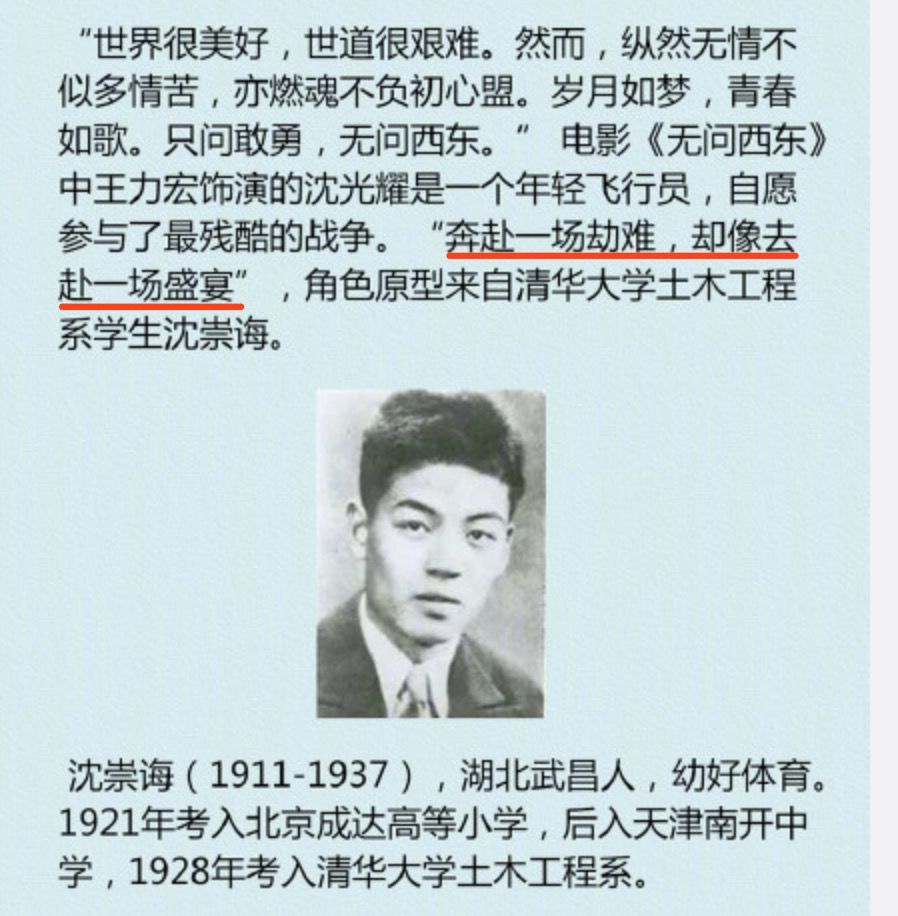 “奔赴一场劫难,就像奔赴一场盛宴”,弃文从军的他,在只有27岁的时候,就献出了自己的生命。 电影里有很多细节让人泪目,有当沈光耀给母亲下跪时,忠孝不能两全的割舍;有沈光耀母亲在翻阅他的遗物之后,还要为报信的军人递上银耳汤(何为真正的贵族); 当镜头打到“三代五将”的牌匾时,才猛然醒悟“绝不从兵”的家训的震撼,原来这不是苟且的富贵人家,而是这个原本庞大的家族,已经为祖国奉献了太多的生命,包括这最后的血脉..... 在那个条件异常艰难的年代里,做飞行员,跟装备精良的日本军作战,明明就是死路一条,可为什么,他们还是义无反顾的去了?他们怎么就不怕死? 沈光耀说,“这个时代缺的不是完美的人,缺的是从自己心底给出的,真心,正义,无畏和同情”。你相信吗,这些我们听来犹如背口号的空话,却被他们恪守着,奉行着。 少年无畏的真心,为家国天下挥洒生命的热血,现在的我们,还看得到吗? 你相信吗? 有一种高贵其实比成功更重要 在一片断垣残壁里静听雨声,在爆炸声里运送恐龙的骨架,在敌军的轰炸机在头上盘旋轰鸣时,壕洞里支起黑板拿起书本讲课..... 他们让我看到了,何为读书人真正应该有的样子,作为芸芸学子们,应该有着怎样的高贵。 不是茴香豆的茴字有几种写法的“迂”,而是一股“为中华之崛起而读书”的“真”;不是见利忘义投机取巧的“精”,而是“苟利国家生死以”的“勇”。