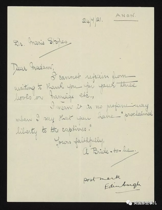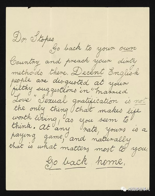 还有一些,是不同意书中的观点,觉得她败坏风气,写信来责怪Stopes的。 # “你不觉得,丈夫如果不是用妻子来怀孕,妻子不是为了被丈夫使用而怀孕,性生活就很肮脏吗? 更重要的是,难道说一个人应该放纵自己的欲望,女性应该单纯为了快乐而做吗?” # “滚回你的国家去吧!(Stopes出生于爱丁堡),顺便把你肮脏的思想带回去! 体面的英国人对你书中的建议感到十分恶心! 性满足并不是唯一的能让生活变成你说的那样的方法。 无论如何,反正你也是来哗众取宠赚钱的。 回你老家去吧!”