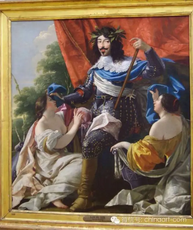 《在路易十四的肖像前,雕塑咨询绘画》(Sculpture consulting Painting over the portrait of Louis XIV),作者Jacques Prou。Jacques Prou(1655–1706)是法国雕塑家,他曾经参与路易十四的凡尔赛宫的大量雕塑工作。他的岳父是凡尔赛宫的著名大型喷泉《阿波罗喷泉》(Fountain Apollo)的作者Jean-Baptiste Tuby。路易十四时代,为了填充凡尔赛宫和其他宫廷和城堡,建立了一批艺术品工厂和画室,大量生产绘画,雕塑和家具等。这件作品以拟人化的形象,描述雕塑与绘画两个“人”在讨论艺术问题。