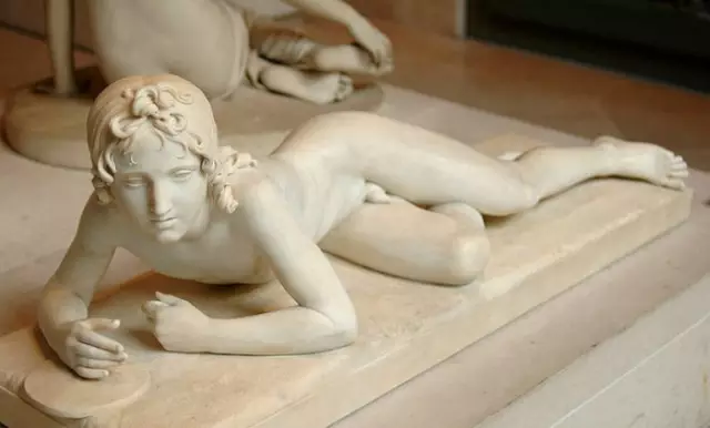 《风信子》(Hyacinth),作者Francois Joseph Bosio。希腊神话:他是马其顿王子,阿波罗钟爱的美少年,有一次与阿波罗玩掷铁饼游戏,不幸被铁饼打中头部,流血不止而死去。阿波罗无比悲伤。他的血长出一种花,这种花即以他的名字命名为风信子(Hyacinthus)。
