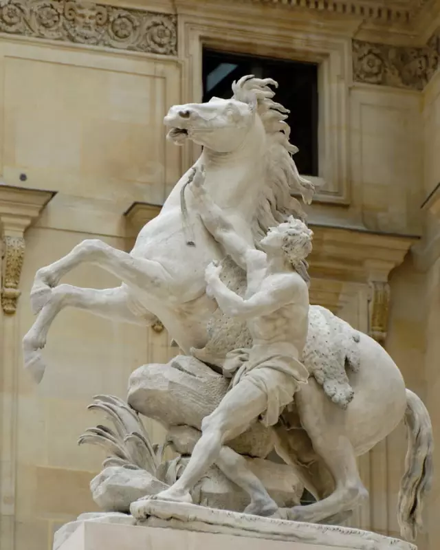 凡尔赛宫的两匹Marly horse 之一,是凡尔赛宫的最大型的雕塑。凡尔赛宫的Marly horse,原来是古罗马的康斯坦丁大浴场发现的巨型战马与驯马人的雕塑,其原型是古希腊的雕塑。拿破仑打到意大利后,想尽办法也无法搬走。于是在法国建造了复制品。