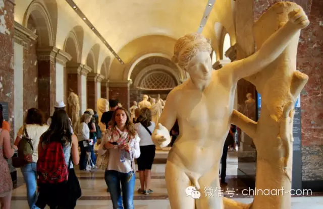 从《蒙娜丽莎》展室通到大画廊,在位于大画廊的中部走道上有这样一尊雕像,罗马战士坐在一个圆形的战车上,就在这个塑像附近,能找到达芬奇的油画连成一排,除了《蒙娜丽莎》外还约有五六幅。达芬奇一生的作品并不像其他画家那样传世很多,所以能在卢浮宫见到达芬奇的这些主要作品,非常幸运了。