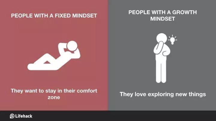 固定思维的人:喜欢呆在舒适区中。 成长思维的人:喜欢探索新事物。