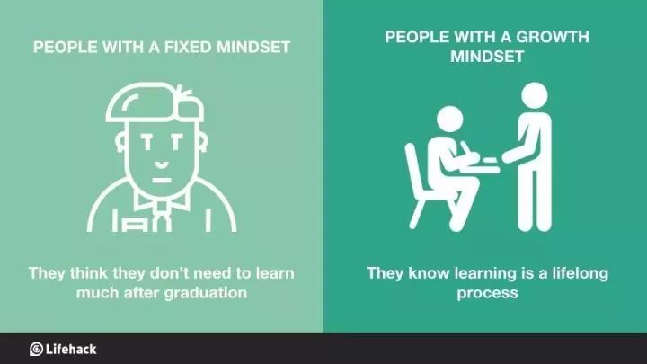 固定思维的人:认为毕业后无需过多学习。 成长思维的人:认为学习是终身的事业。