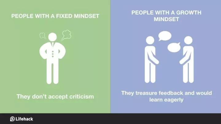 固定思维的人:不接受批评。 成长思维的人:珍视反馈、主动学习。