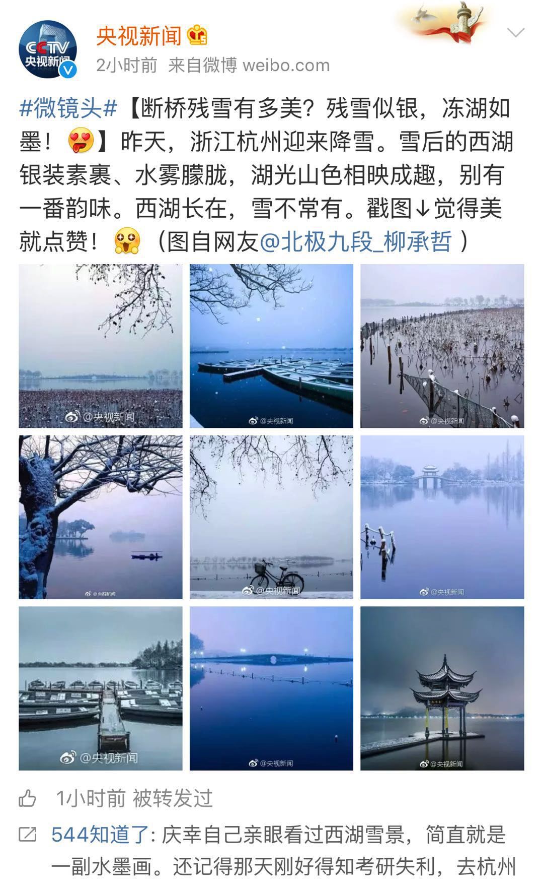 不仅如此, 西湖的美还惊动了央视! 发布多条微博为西湖打call!