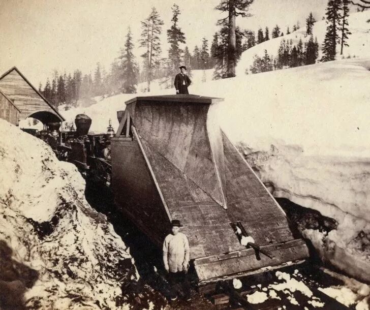 (华工与当时的“怪兽机器”除雪机,拍摄于1868年前后内华达山脉的一个山口Emigrant Gap,可以看到铁路沿线积雪极深,“怪兽”负责将雪挤到两侧,火车便可以通过了;摄影师@Alfred A.Hart,图片源自@斯坦福大学北美铁路华工研究工程)