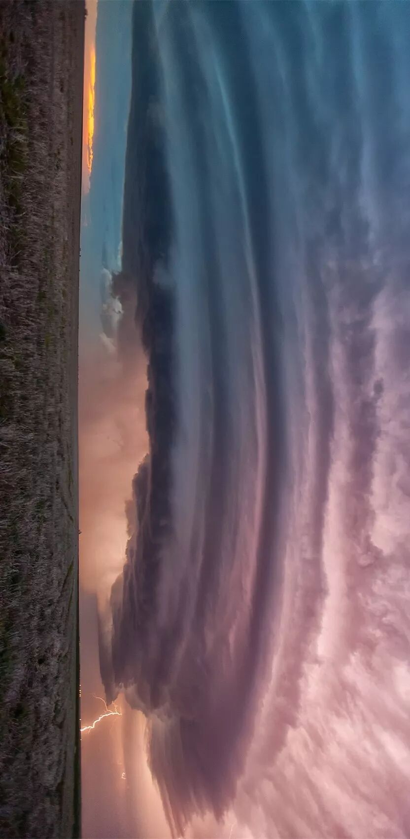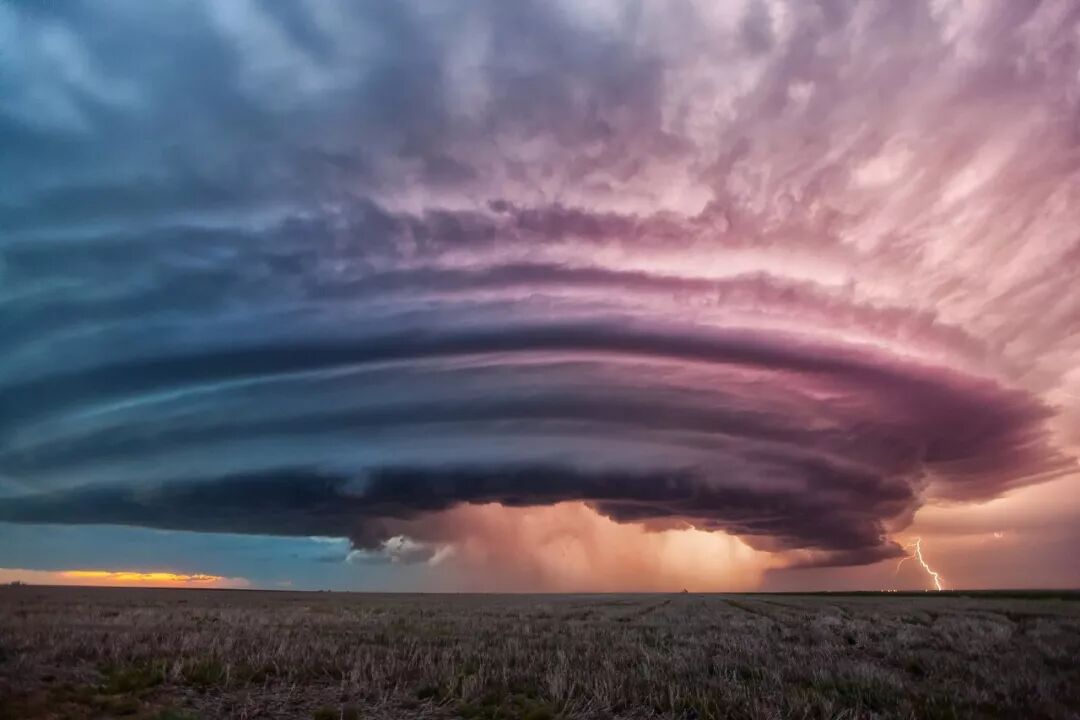 (请将手机横屏观看,大平原上多发的超级单体雷暴,一种破坏力极强的雷暴现象,中心是一个中气旋,该气旋能够旋转上升几公里,并带来闪电、暴雨、大风、冰雹;图片源自@VCG)
