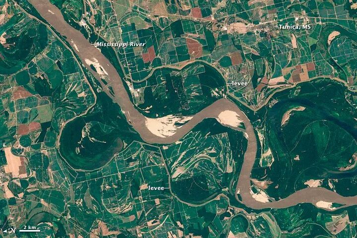 (密西西比河田纳西州孟菲斯河段,由Landsat卫星拍摄于2011年8月14日,图片源自@NASA)