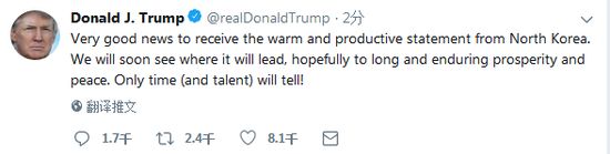 特朗普也见好就收,很快回应说:“他们发布了一份非常不错的声明,我们将看看会发生什么。(朝美首脑会晤)甚至还可能于6月12日举行,朝方非常希望举行会晤,我们也愿意。我们将拭目以待。”并赞扬说这是一份“热忱而富有成效的声明”。