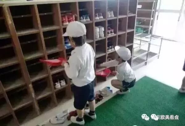 所以,我们常看到在日本学校的一进门处有一排排这样的鞋架。体育课也要换成统一的运动鞋,鞋面用颜色区分年级,也会用马克笔写上名字跟班级!