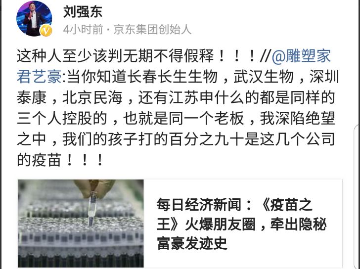 人民日报官方微博:连狂犬病疫苗也敢造假,既胆大包天,又伤天害理。幸亏所涉批次产品尚未上市销售,否则后果不堪设想。疫苗关涉生命安全,来不得丝毫猫腻,容不得半点瑕疵,也使不得一点侥幸。用彻查还原真相,依法处理打消公众恐慌,确保药品安全。