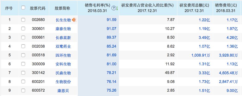 虽然整个疫苗行业都是高毛利率,但长生生物的表现尤为突出——其以91.59%的毛利率占据行业首位,比贵州茅台91.31%的销售毛利率还高。