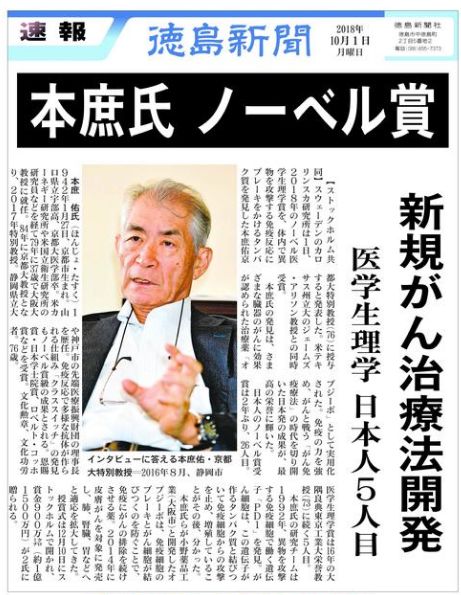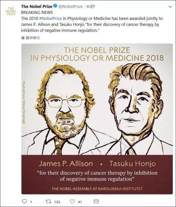 10月1日,来自美国的免疫学家詹姆斯·艾莉森和日本免疫学家本庶佑(Tasuku Honjo)获得2018年诺贝尔生理学或医学奖。表彰他们“通过抑制负免疫调节在癌症治疗方面的发现。”