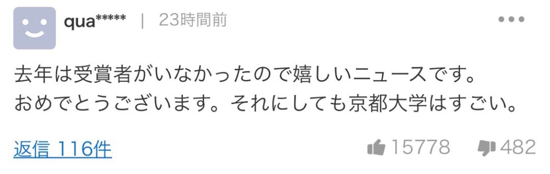 去年日本没有人获得诺贝尔奖,听到这个消息真的是非常开心。恭喜,京都大学真的很厉害呢。