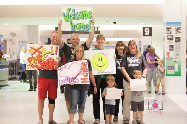 三个人终于登上回美国的飞机。一下飞机,Selah就看到一大群人拿着欢迎她的横幅,热情地接机。