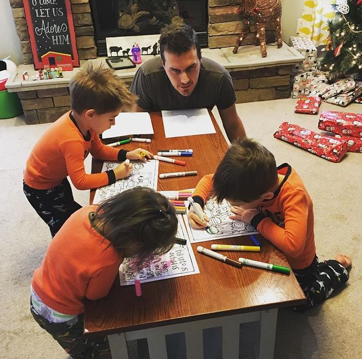 冬夜里,三兄妹专心地涂油漆画,爸爸在一旁耐心指导。