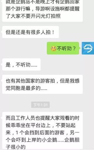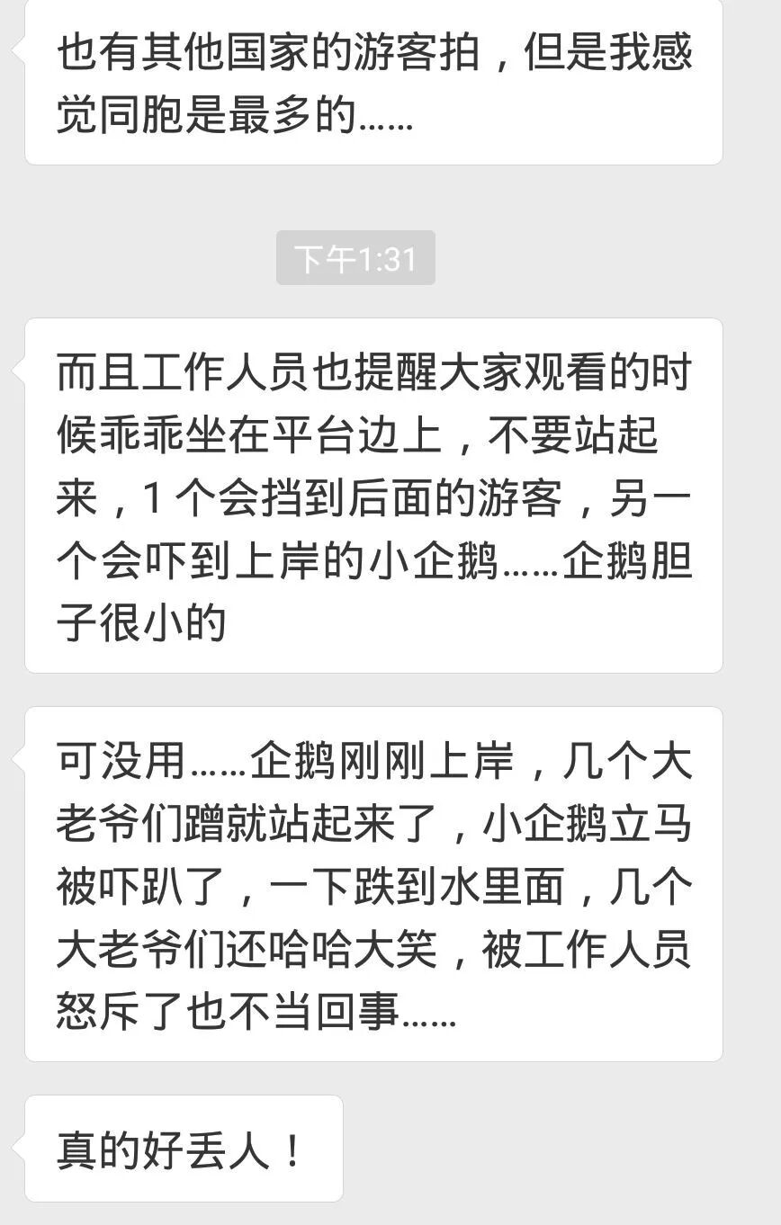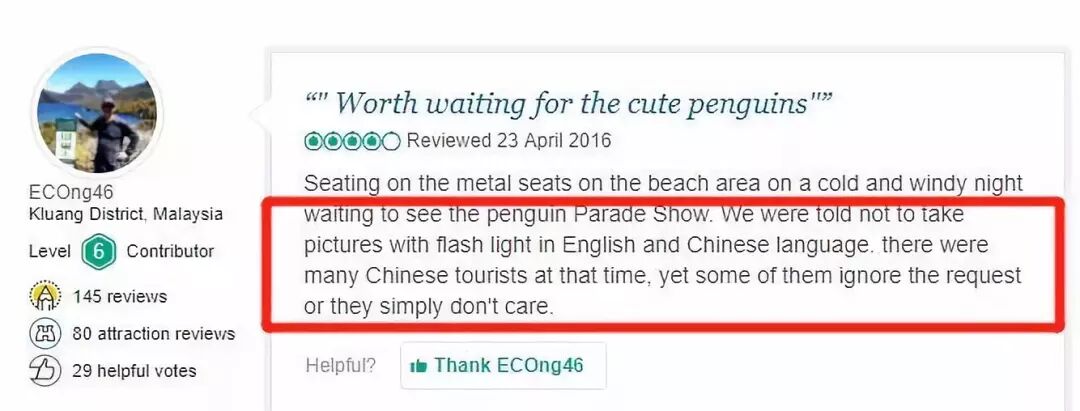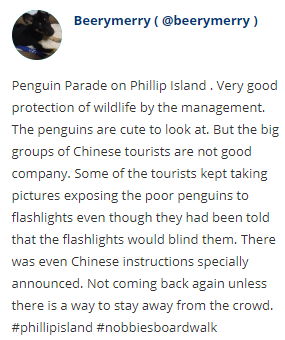 “中国的旅游团真的不好。个别人无视警告,多次使用闪光灯拍摄小企鹅,哪怕已经有中文警告告诉他们闪光灯会弄瞎小企鹅!”