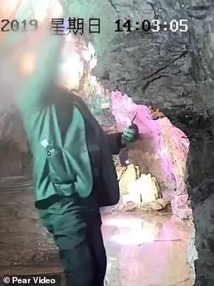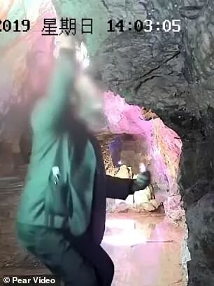 另外两名乘客也开始了同样的动作,随后其中一人敲断了岩壁上的一块钟乳石并带走。整个过程一气呵成,行云流水,只花了不到30秒。