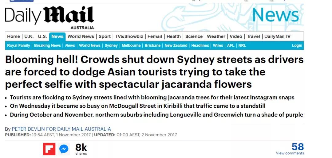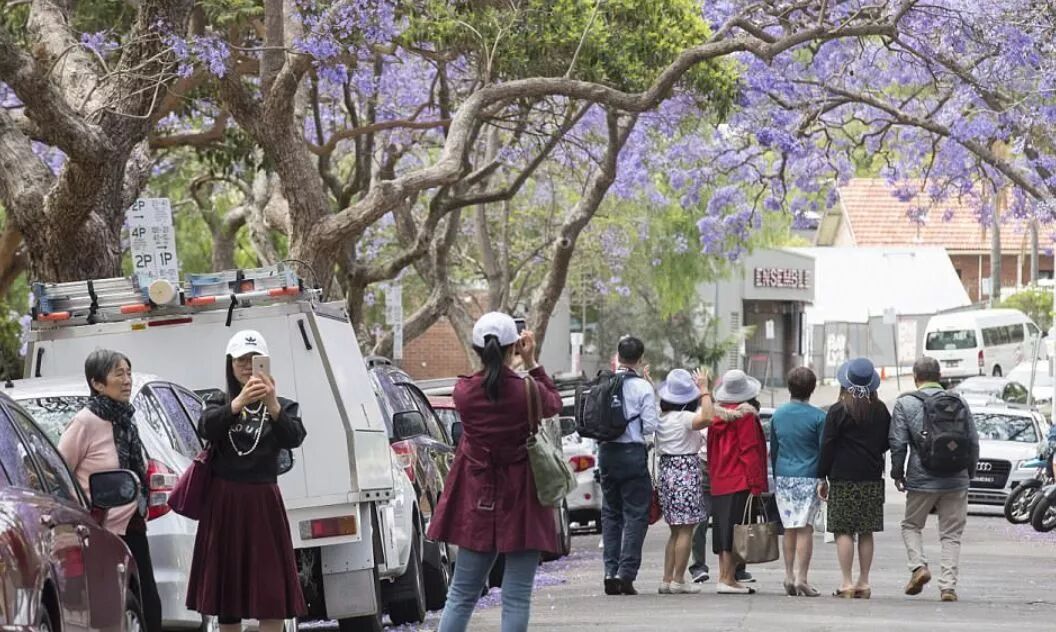 每年春天,澳洲著名的蓝花楹就会盛开,吸引来一大批拍照的中国游客。