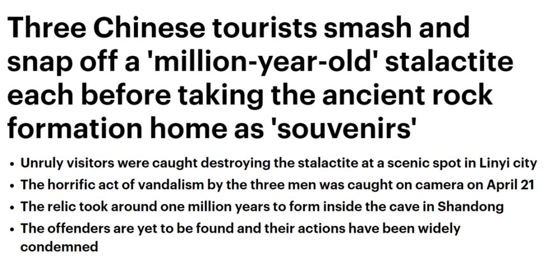 据《每日邮报》报道,前两天,有三名中国游客在山东一景区的岩洞内观光时,顺手掰下了洞内百万年的钟乳石,造成了不可挽回的损失。
