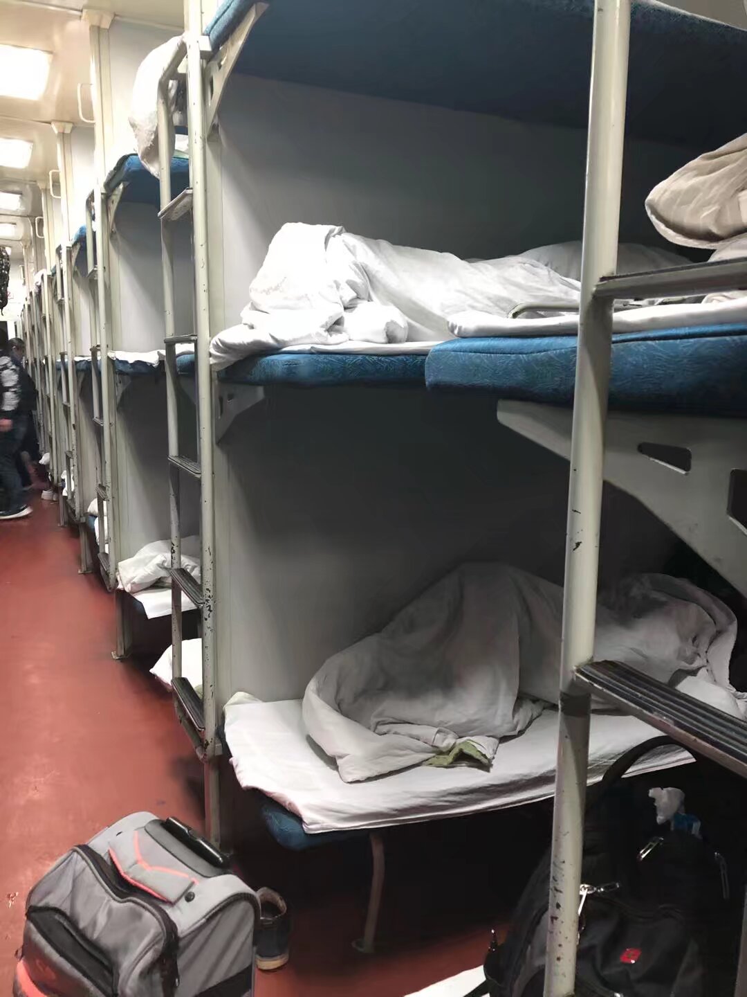 穿过十几节黑漆漆的车厢走道,待回到16车厢,已经没有了人声。都睡过去了。列车员大姐也在最头前的铺上坐着打盹儿。我没敢惊动她,径直爬到自己铺上。一会儿大姐过来了:“你怎么又回来了呢,这么大老远的?” 我也没多言语,就说车长没给办。大姐说,“那我给你换一下,你过来睡我们列车员的铺。不然南京站上来的乘客,如果正好接你铺的话,会把你轰走,你也睡不好”。我谢过大姐,跟着她走。躺下之后,大姐过来给我又加了一床被子,“车厢两头风大,别冻着。一觉睡到芜湖吧!”