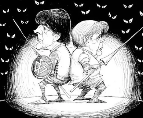 漫画:左为德国队的主教练,右为默克尔 默克尔所说的“一场炼狱”指的是自己在欧洲难民问题上“腹背受敌”。6月28日至29日,欧盟夏季峰会在布鲁塞尔召开,此次峰会将讨论难民解决方案,达成与否将直接影响默克尔的政治生涯。为了“抢先手”,默克尔在6月24号发起了一次“小峰会”,希望同欧盟最重要的成员国提前达成接收难民的协议,以减轻压力。不过此次“小峰会”无果而终,默克尔的愿望也随之落空。