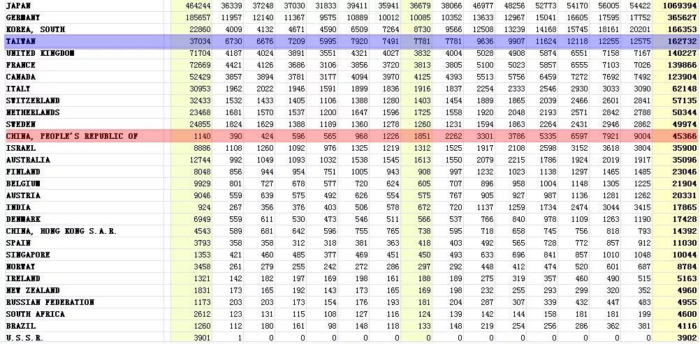 截止2015年底,世界各國獲美國專利局授權專利數量排名: