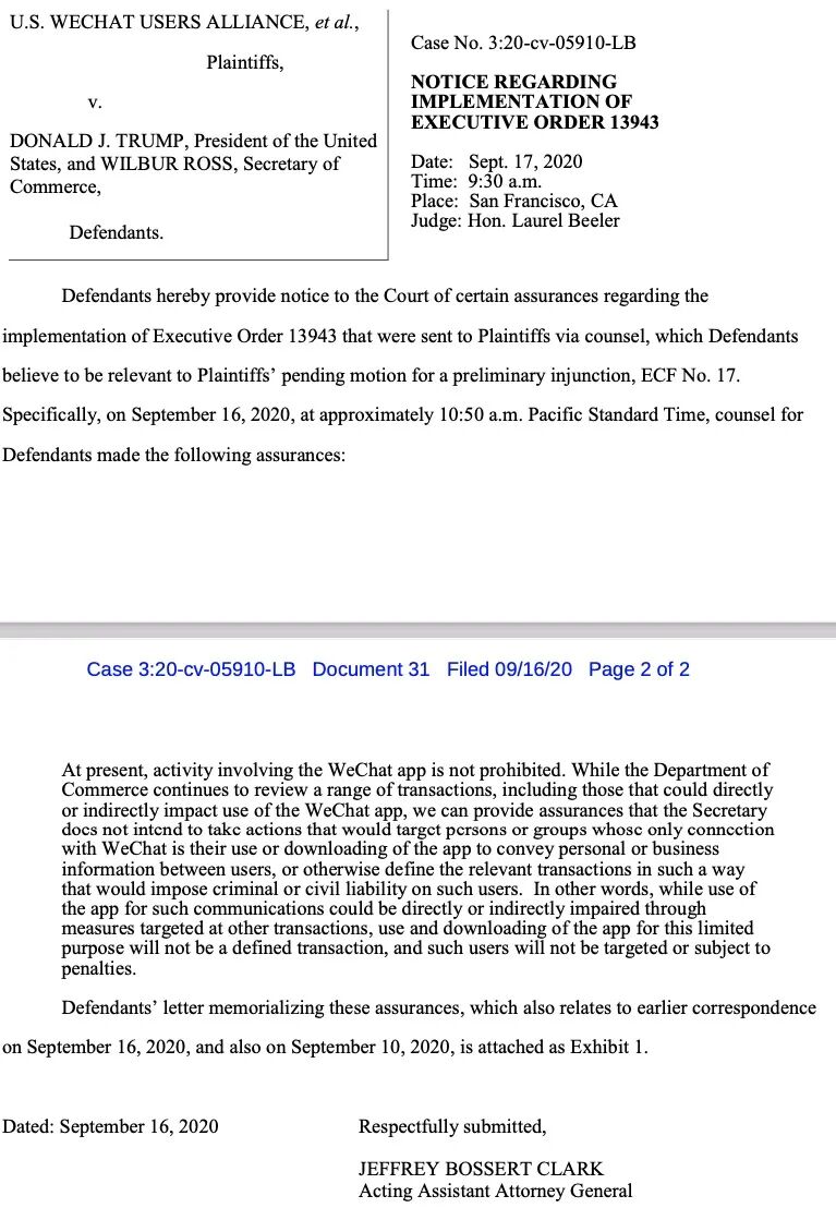 美国西部时间9月17日上午,该诉讼召开了首次听证会。首次听证会前一天(16日),美国司法部曾提交文件称,商务部长罗斯并不打算对仅下载或使用WeChat传输个人或商业信息的个人或团体采取行动,并声称他们不会面临刑事或民事处罚。但“该应用的此类交流功能,可能会因针对其他(WeChat)业务的措施而受到直接或间接损害。”美国司法部向法院公开的信件表示:民众和组织机构出于个人和商业目的仍可以照常使用微信进行沟通,司法部不会追究他们的法律责任。美微联会当时认为,这个妥协方案只是一个单方面承诺,没有总统或商务部长签字,也没有得到法官认可,所以其实没有法律效力。而且里面的文字给美国政府留了很多空间。比如,虽然声明称普通WeChat用户继续使用不会受到惩罚,但并未说明美国政府以后会不会强迫谷歌或苹果商店下架这一应用软件,也没有就WeChat的支付和其它功能是否违反行政令做出明确的定义。18日商务部禁令细则出台后,北加法院紧急二次开庭,并定于今天(19日)下午1点30分再次庭审。
