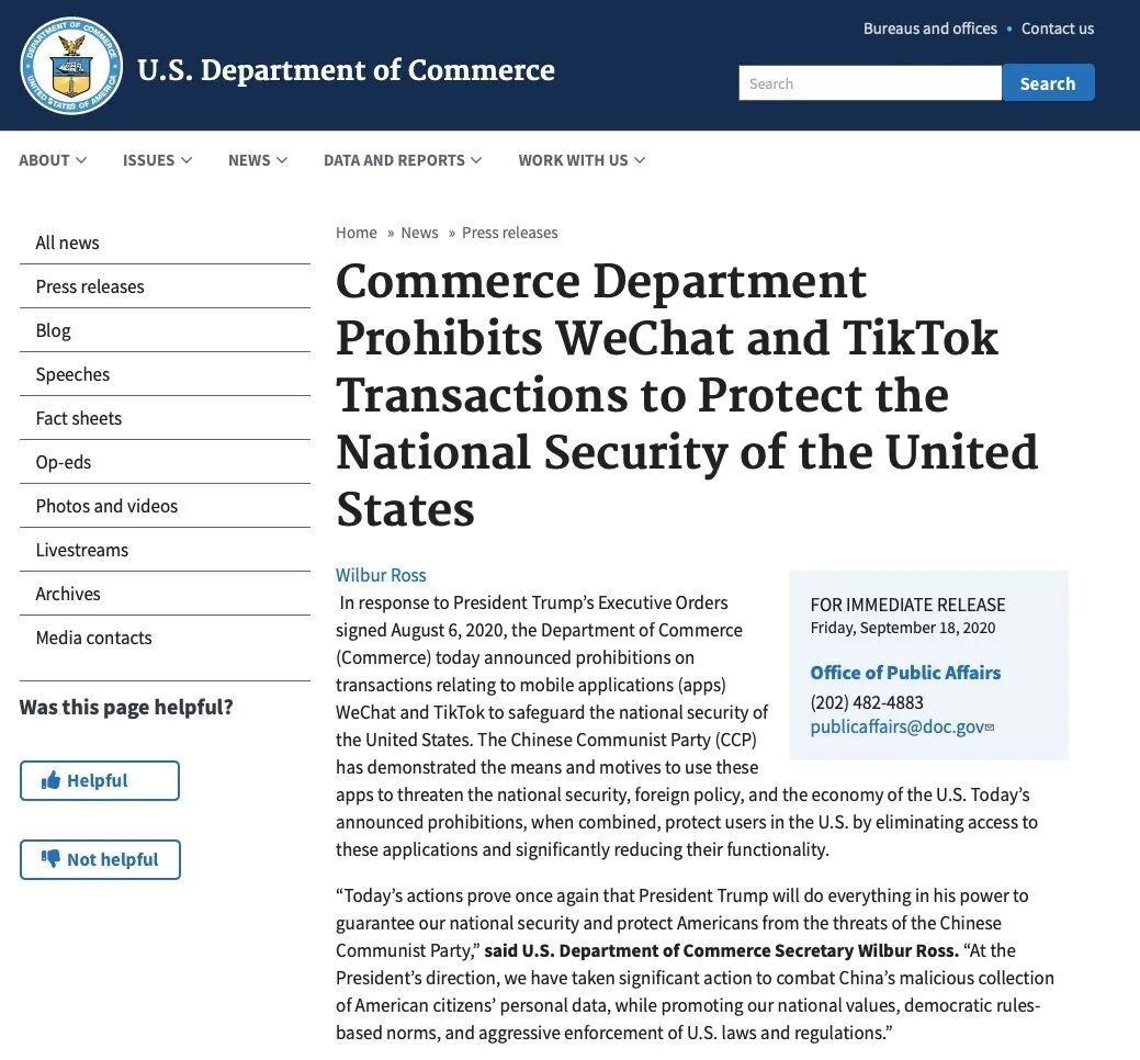 https://www.commerce.gov/news/press-releases/2020/09/commerce-department-prohibits-wechat-and-tiktok-transactions-protect商务部官员接受路透社等美国媒体采访时表示,此命令一不影响在中国开展业务的美国公司(比如沃尔玛、星巴克等使用微信小程序服务中国消费者),二不针对个人用户,“我们的目标是在企业级别(实施打击),不会追究个人用户不放。” - 苹果和谷歌将会把微信从 App Store 和 Google Play 美国商店内下架。新用户将无法在美国的应用商城渠道下载微信。