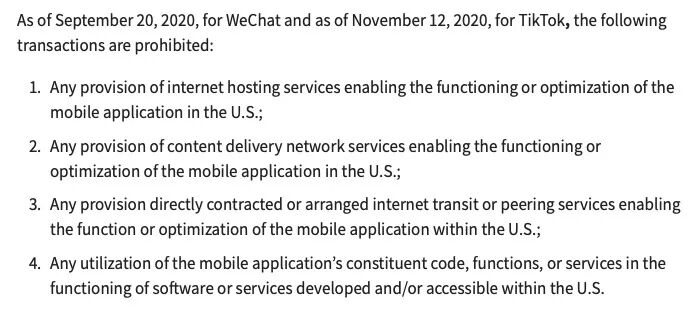 另外,微信从2020年9月20日起,抖音从2020年11月12日,还将禁止: - 在美国境内提供任何互联网托管服务,以支持移动应用程序的功能或优化;