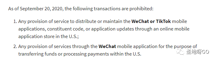 - 在美国开发或者可以使用的产品,其开发者不得使用微信提供的代码、功能和服务,意味着第三方公司必须移除所有微信方面的 API、SDK,嵌入的分享、收付款功能等。