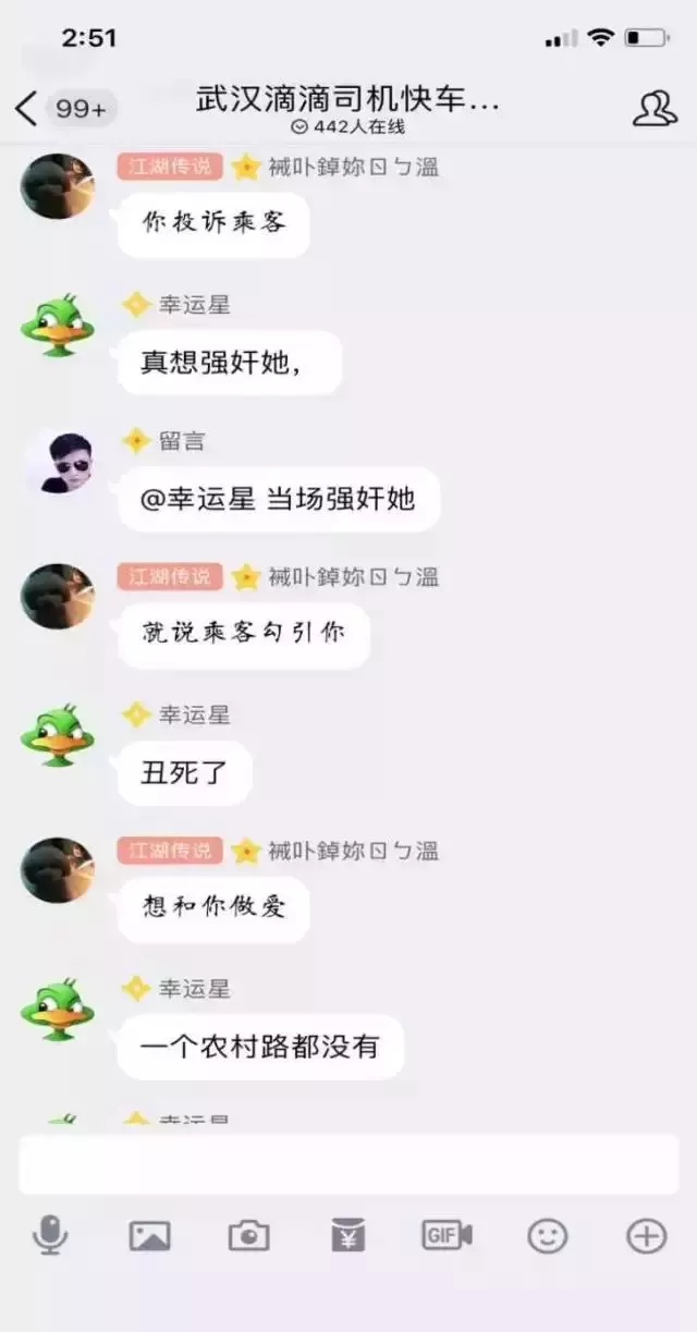 一名司机因为乘客投诉他,就在群里声称要强奸乘客,而其他司机在这个时候是怎么做的呢?有人怂恿强奸乘客,也有人出主意表示要强奸乘客后诬陷乘客勾引司机。
