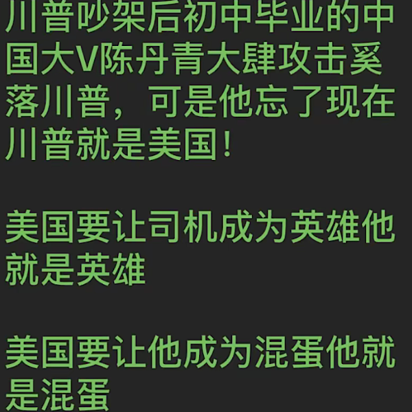 舒慷慨、写选战、记国风。随身起舞,舞出自由之豪情。细检《美国简史》,详查人类文明,未有此鹰风。人民登山唱,流韵壮西风。 ~~~~~~~~~~~~~~~~~~~~~~ 川普归来,美国的黄金时代开始! ~~~~~~~~~~~~~~~~~~~~~~~~~ 大道至简美国优先——MAGA •让美国再次安全 •让美国再次具有负担能力并占有能源主导地位 •排干沼泽 •恢复美国价值观 ~~~~~~~~~~~~~~~~~~~~~~~~~~~~~ 政治止于边界,川普对等哲学, Truth&Common Sense,信仰上帝忠于自己。 ~~~~~~~~~~~~~~~~~~~~~~~~ 大陆中国六无:无哲学无逻辑无历史无真相无法无天 ~~~~~~~~~~~~~~~~~~~~~~~~~~~~