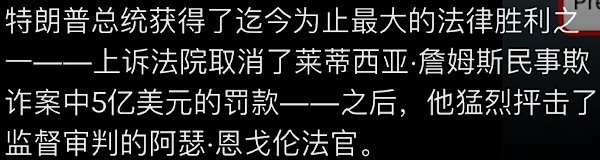 我要感谢并祝贺我的儿子埃里克·特朗普,以及特朗普组织中为正义而努力奋斗的所有人。我的法律团队拒绝在沉重的困难中放弃。