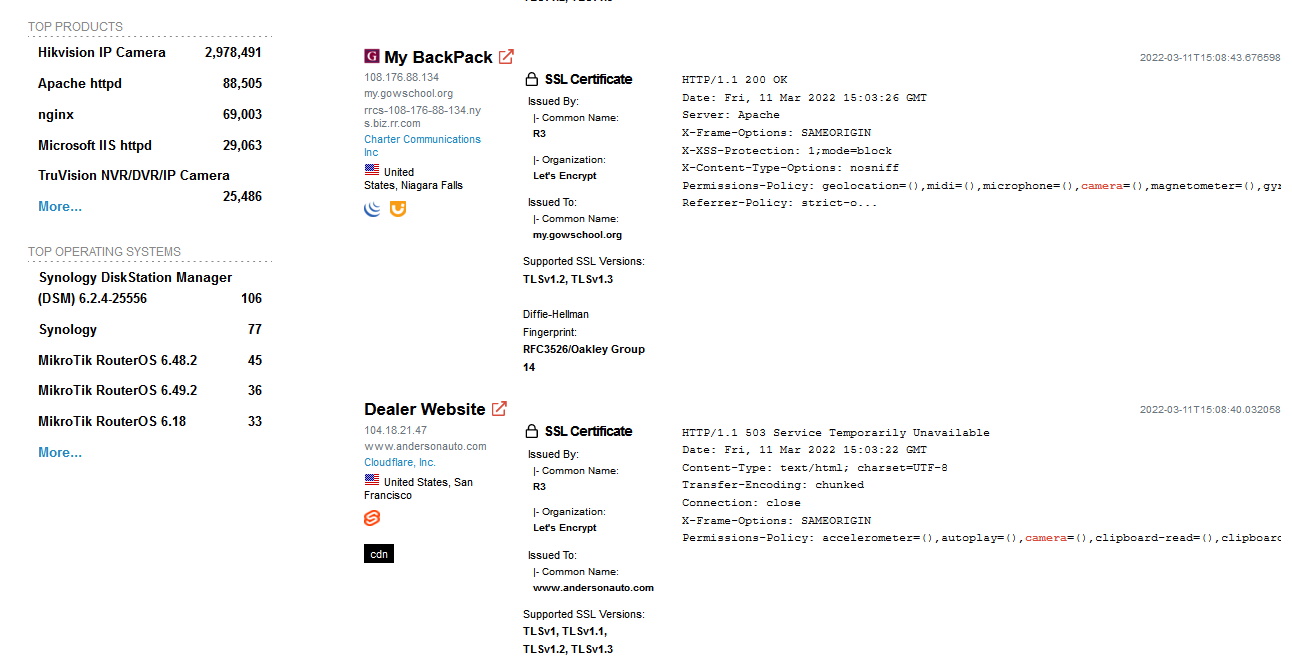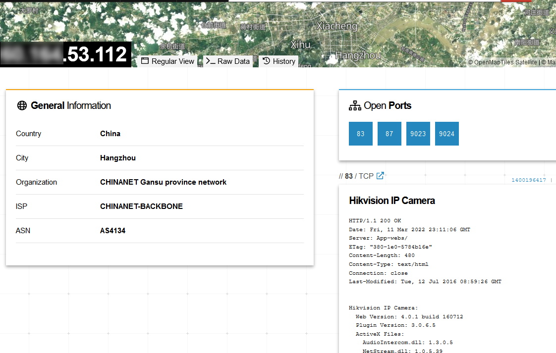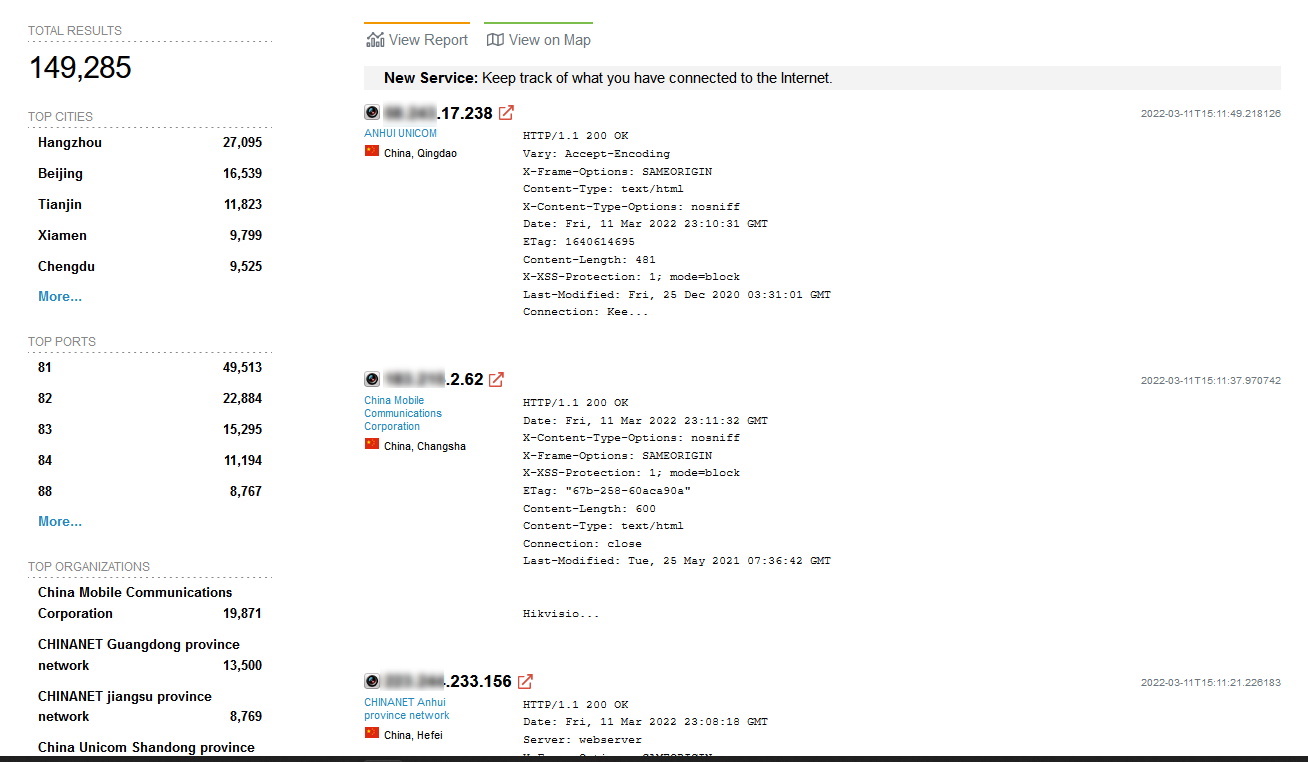 按设备生产厂家排名来看,海康威视(HiKvision)的摄像头排名第一,有298万台。在右边还列出了所在地的名称,IP地址的等信息。