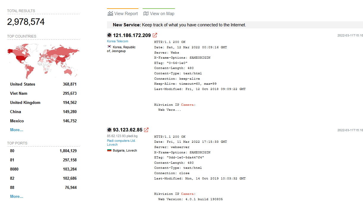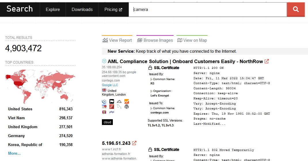 我们先来查询一下摄像头,输入英文字母camera,发现全球有490万个网络摄像头可以进入观看,这些摄像头有些是完全没有密码保护,有些有简单的密码保护,比如12345。不少用户认为他们的网络摄像头只要自己不说,一般人根本查不着。就算你知道我有网络摄像头挂在网上,大海捞针,你去哪里查呢?实际情况早已不是这样,就像很多商用的免费卫星照片,把你在地面的建筑物标识得清清楚楚一样,你的网络设备也早已标记得清清楚楚,也许只是你自己不知道,懂行的人早就知道。